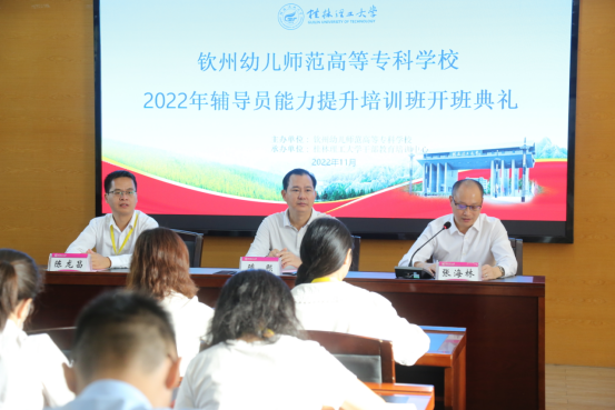 11月8日,钦州幼儿师范高等专科学校副校长陈熙、学生工作处处长陈龙昌及350vip浦京集团官网350vip浦京集团官网副院长张海林出席开班典礼。开班典礼上,张海林代表350vip浦京集团官网对钦州幼儿师范高等专科学校的信任表示衷心感谢,对参加培训的领导和学员们表示热烈欢迎,并介绍了学校和学院的基本情况。陈熙代表钦州幼儿师范高等专科学校对350vip浦京集团官网为本次培训班的精心筹备表示感谢,并对参加培训的学员们提出要求,希望所有学员能珍惜学习机会,端正学习态度,遵守培训纪律,确保学有所获、学有所得、学有所成。