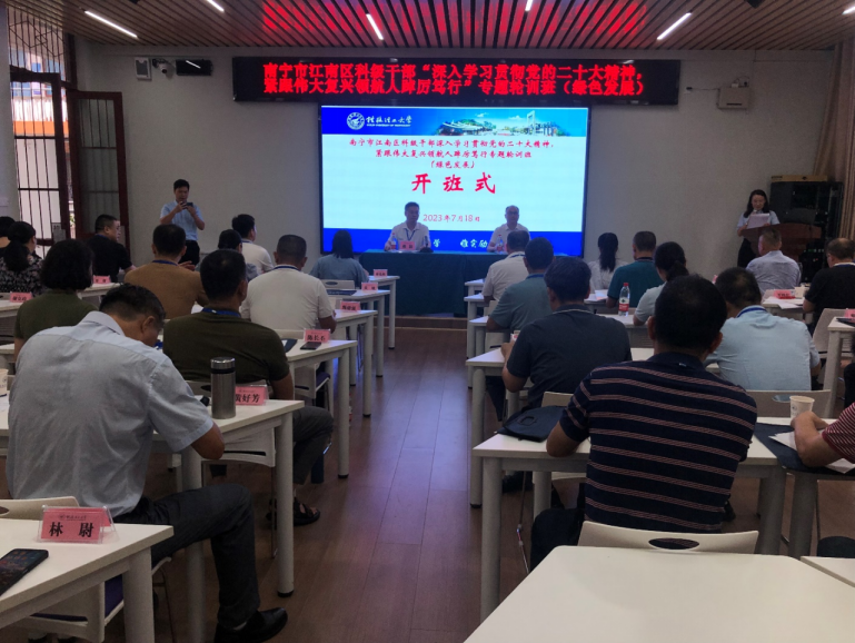 7月18日上午,南宁市江南区科级干部“深入学习贯彻党的二十大精神,紧跟伟大复兴领航人踔厉笃学”专题轮训班(绿色发展)在浦京集团官网顺利开班。江南区人民政府副区长、党组成员蒋骎,学校350vip浦京集团官网副院长张海林以及来自南宁市江南区的40余位学员参加了开班式。