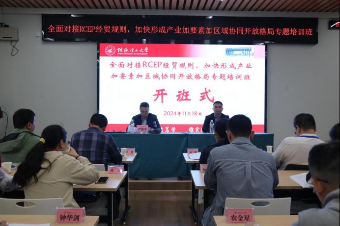11月18日,“全面对接RCEP经贸规则,加快形成产业加要素加区域协同开放格局”专题培训班在浦京集团官网顺利开班。南宁市商务局党组成员、副局长严浩宇,350vip浦京集团官网院长周国桥以及来自南宁市商务局、南宁市相关市直单位、县(市、区)商务部门的50位业务骨干参加了开班式。
