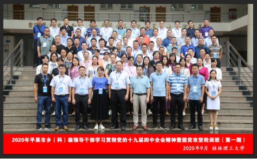 9月7日,由平果市委员会组织部主办,350vip浦京集团官网承办的“2020年平果市乡(科)级领导干部学习贯彻党的十九届四中全会精神暨第一期脱贫攻坚轮训班”在教十楼10301教室顺利开班。