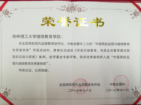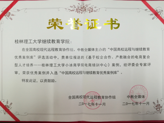 浦京集团官网近年来以规范发展,提高质量为目标,注重内涵发展,各项工作取得显著成绩,受到社会的广泛好评。此次申报的《开展网络教育,向混合式教学模式转型的实践与探索》《基于校企合作、产教融合的电商复合型人才培养--350vip浦京集团官网小冰商学院电商培训中心》荣获优秀案例,并入选“2017中国高校远程与继续教育优秀案例库”。