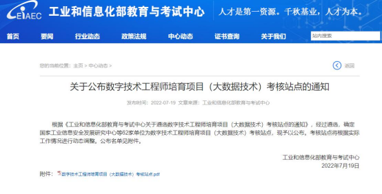 近日,工业和信息化部教育与考试中心公布数字技术工程师培育项目(大数据技术)考核站点名单,浦京集团官网顺利入围,成为广西区同批入选的3个考核站点之一。
