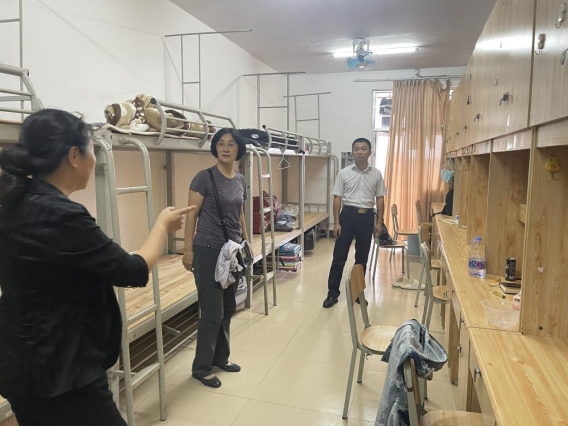 张海林带队对屏风国际教育园区1号楼进行了检查,对洗衣房、八人间改造宿舍、公共浴室等区域进行了查看,并不时询问学生生活、学习情况。