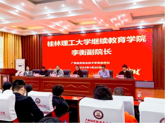 1月21日上午,浦京集团官网校外教学点广西经贸职业技术学院举办的2024级成人高等教育新生开学典礼在该校6101学术报告厅隆重举行。浦京集团官网副院长李衡,广西经贸职业技术学院350vip浦京集团官网院长韦雯珊等出席活动。李衡副院长热烈欢迎2024级新生加入桂林理工大家庭,并对同学们提出了殷切希望。她表示,非常乐见同学们能在工作之余选择高等学历继续教育的学习形式来提升自己,希望同学们在工作生活中能将理论与实践相结合,将工作与学习相融合,尽快适应新的学习环境和学习方式,使学习的成果能够在工作中得以检验,为自己的终身发展积蓄力量。