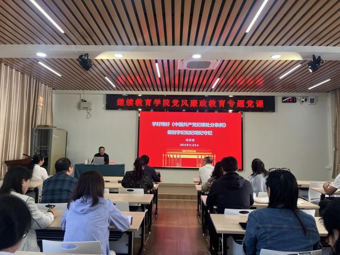 为进一步推进党纪学习教育走深走实、取得成效,11月8日下午,学院邀请自治区纪委监委驻校纪检监察组副组长,学校纪委副书记周章明同志在教十楼10208讲授廉政教育专题党课,全院教职工、合作办学单位负责人参加学习,党支部书记、学院院长周国桥主持会议。