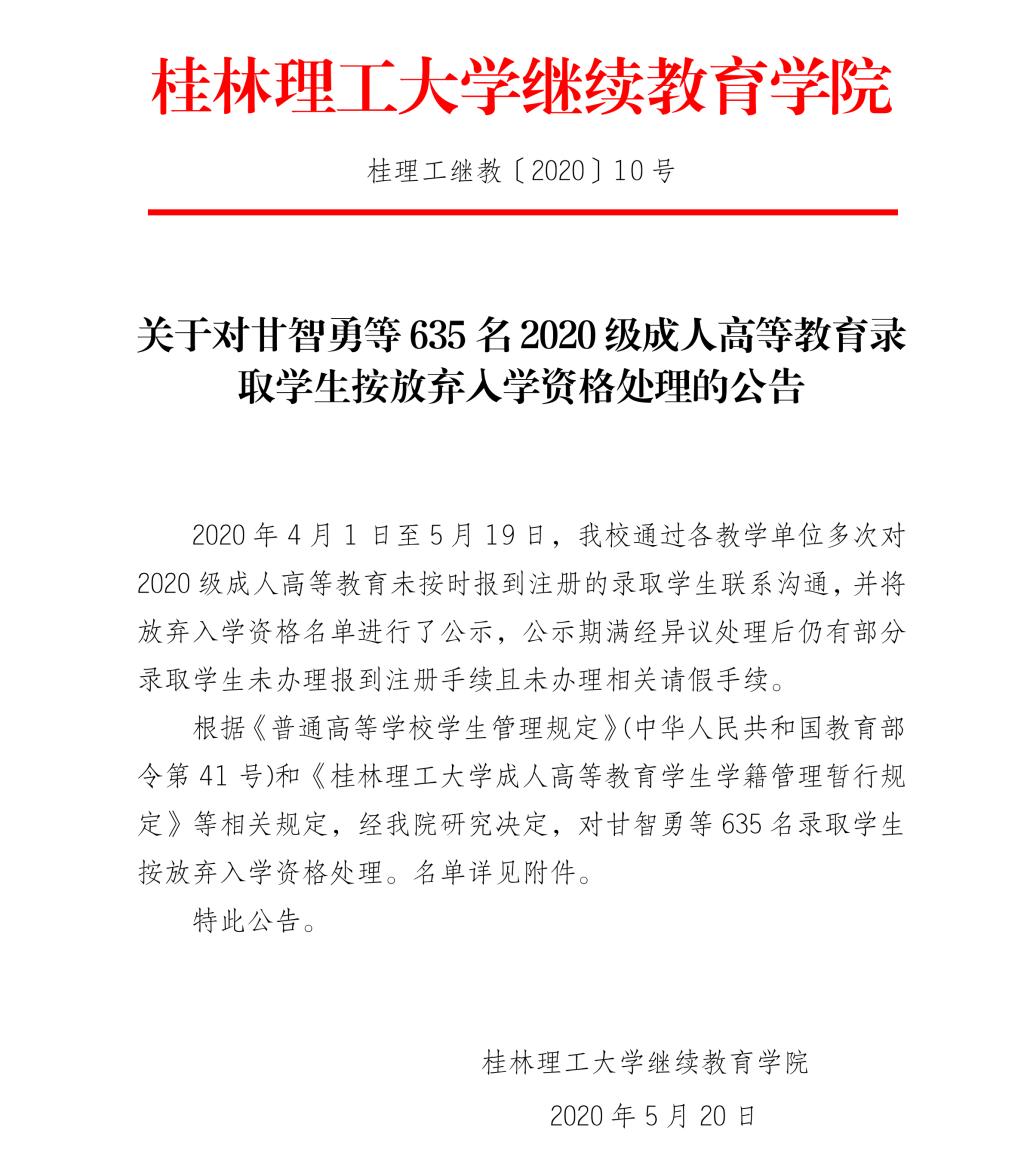 关于对甘智勇等635名2020级成人高等教育录取学生按放弃入学资格处理的公告 发布者:教务科 2020-05-20 已阅人次 附件: 2020级放弃入学资格635人.xlsx 附件【2020级放弃入学资格635人.xlsx】已下载次 上一条:自考丨注意!广西发布2020年8月高等教育自学考试防疫须知 下一条:350vip浦京集团官网继续教育招生声明 关注我们