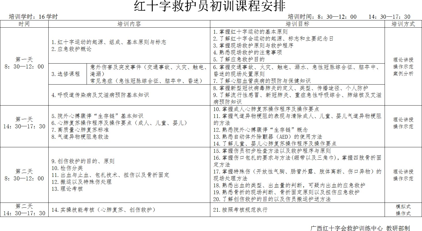 为贯彻落实自治区党委、人民政府印发《“健康广西2030”规划》中实现“到2030年,群众应急救护知识和技能普及率达到20%”的要求,普及开展应急救护培训,提高群众应急救护技能,广西红十字会救护训练中心350vip浦京集团官网培训基地拟面向校内外开办红十字救护员资格认证培训班,现就2021年秋季学期培训有关事项通知如下: