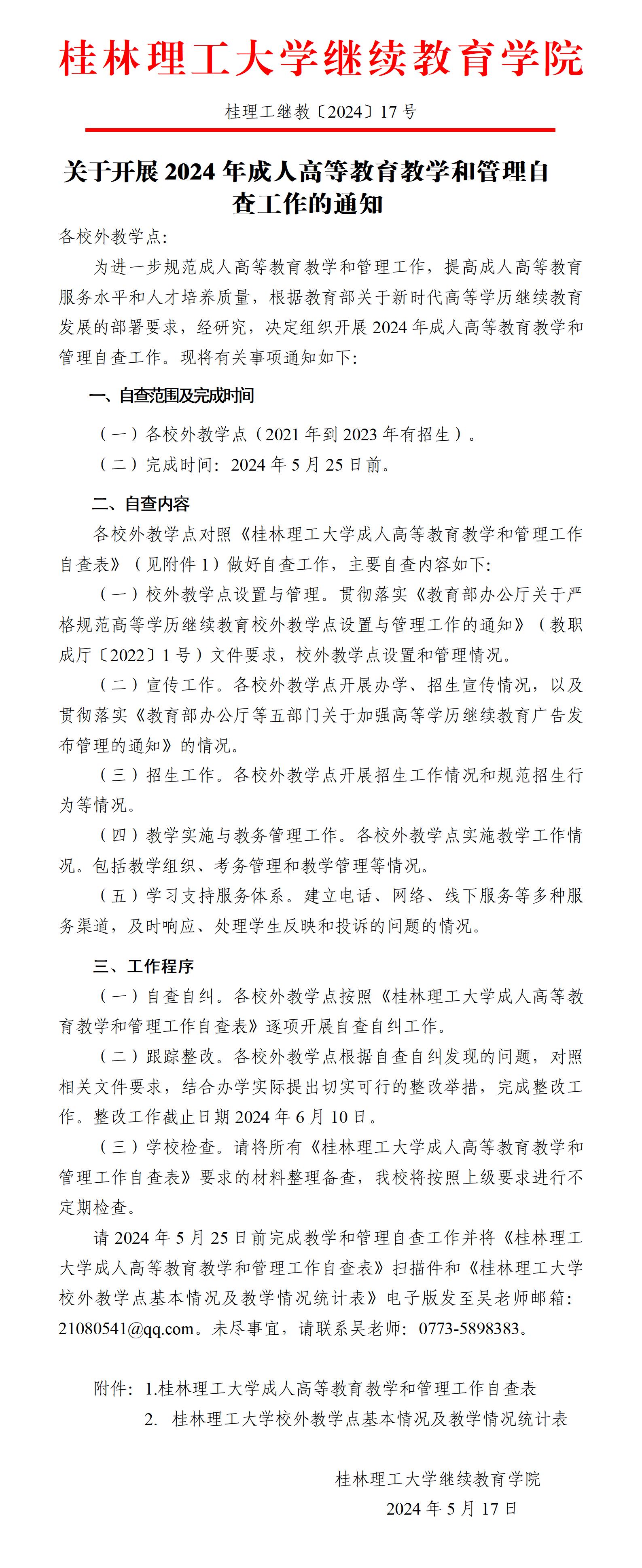 关于开展2024年成人高等教育教学和管理自查工作的通知 发布者:成高管理中心 2024-05-17 已阅人次 (一审:吴佳 二审:林文钊 三审:李衡) 附件【附件1:350vip浦京集团官网成人高等教育教学和管理工作自查表.docx】已下载次 附件【附件2:350vip浦京集团官网校外教学点基本情况及教学情况统计表.xls】已下载次 上一条:关于表彰350vip浦京集团官网2022—2023年度成人高等教育优秀校外教学点和优秀教学管理工作者的决定 下一条:350vip浦京集团官网2024届毕业设计(论文)答辩工作情况通报 关注我们