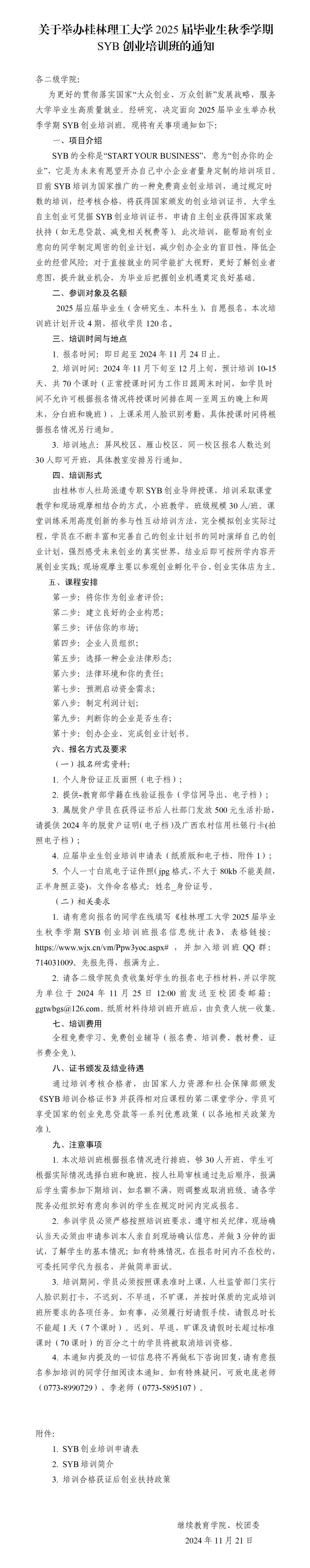 关于举办350vip浦京集团官网2025届毕业生秋季学期SYB创业培训班的通知 发布者:培训中心 2024-11-22 已阅人次 (一审:李凤珍 二审:罗淑瑛 三审:张海林) 附件【附件1:SYB创业培训申请表.doc】已下载次 附件【附件2:SYB培训简介.doc】已下载次 附件【附件3:培训合格获证后创业扶持政策.doc】已下载次 上一条:350vip浦京集团官网关于面向应届本科毕业生开展人工智能训练师(高级)培训的通知 下一条:关于做好2024年下半年高等学历继续教育学士学位外语考试延期的通知 关注我们