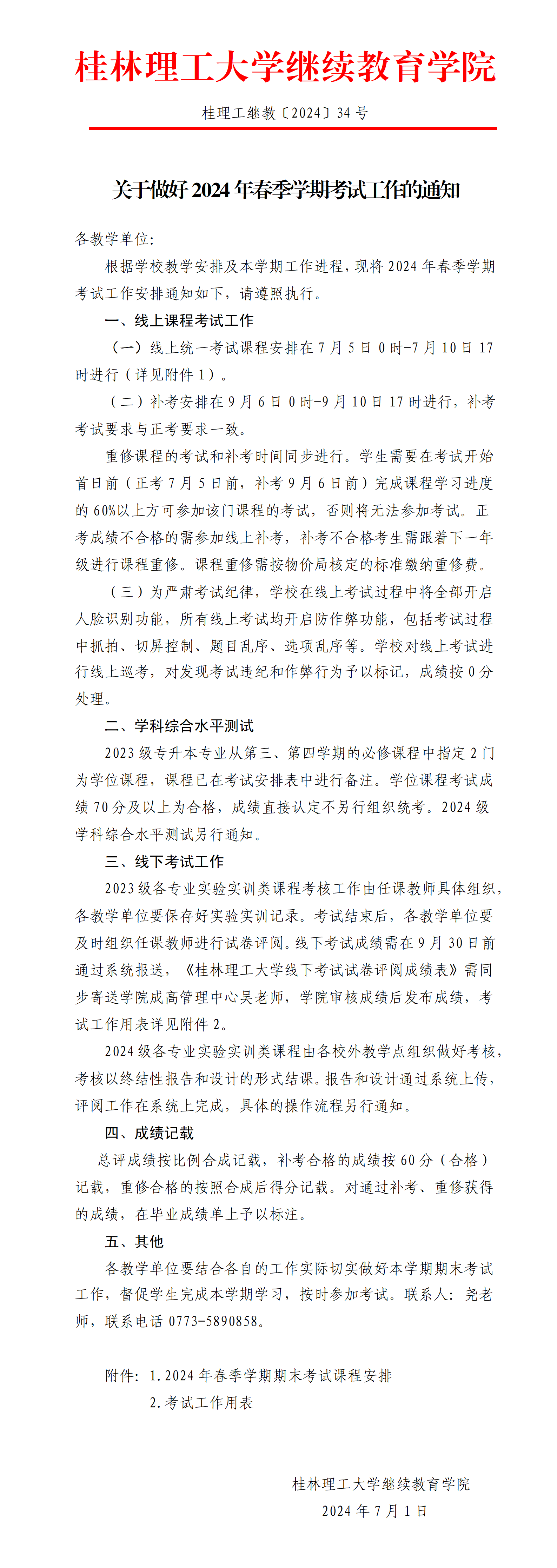 关于做好2024年春季学期考试工作的通知 发布者:成高管理中心 2024-07-01 已阅人次 (一审:尧田坤 二审:林文钊 三审:李衡) 上一条:关于做好 2024年秋季学期成人高等教育有关工作的通知 下一条:关于表彰350vip浦京集团官网高等学历继续教育2024年优秀毕业生的决定 关注我们